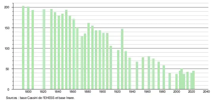 L'évolution du nombre d'habitants est connue à travers les recensements de la population effectués dans la commune depuis 1793. Pour les communes de moins de 10000habitants, une enquête de recensement portant sur toute la population est réalisée tous les cinqans, les populations de référence des années intermédiaires étant quant à elles estimées par interpolation ou extrapolation[16]. Pour la commune, le premier recensement exhaustif entrant dans le cadre du nouveau dispositif a été réalisé en 2004[17].