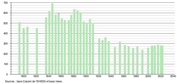 L'évolution du nombre d'habitants est connue à travers les recensements de la population effectués dans la commune depuis 1793. Pour les communes de moins de 10 000 habitants, une enquête de recensement portant sur toute la population est réalisée tous les cinq ans, les populations de référence des années intermédiaires étant quant à elles estimées par interpolation ou extrapolation[13]. Pour la commune, le premier recensement exhaustif entrant dans le cadre du nouveau dispositif a été réalisé en 2005[14].