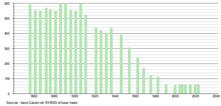 L'évolution du nombre d'habitants est connue à travers les recensements de la population effectués dans la commune depuis 1856. Pour les communes de moins de 10 000 habitants, une enquête de recensement portant sur toute la population est réalisée tous les cinq ans, les populations de référence des années intermédiaires étant quant à elles estimées par interpolation ou extrapolation[18]. Pour la commune, le premier recensement exhaustif entrant dans le cadre du nouveau dispositif a été réalisé en 2004[19].