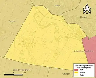 Le retrait-gonflement des sols argileux est susceptible d'engendrer des dommages importants aux bâtiments en cas d’alternance de périodes de sécheresse et de pluie. La totalité de la commune est en aléa moyen ou fort (54,2 % au niveau départemental et 48,5 % au niveau national). Sur les 566 bâtiments dénombrés sur la commune en 2019, 566 sont en aléa moyen ou fort, soit 100 %, à comparer aux 57 % au niveau départemental et 54 % au niveau national. Une cartographie de l'exposition du territoire national au retrait gonflement des sols argileux est disponible sur le site du BRGM[12],[Carte 2].