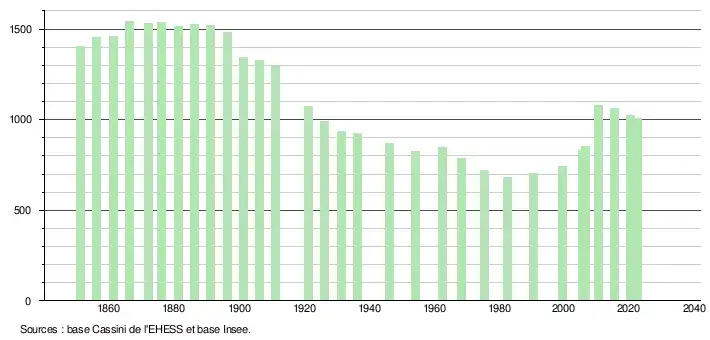 L'évolution du nombre d'habitants est connue à travers les recensements de la population effectués dans la commune depuis 1851. Pour les communes de moins de 10 000 habitants, une enquête de recensement portant sur toute la population est réalisée tous les cinq ans, les populations de référence des années intermédiaires étant quant à elles estimées par interpolation ou extrapolation[15]. Pour la commune, le premier recensement exhaustif entrant dans le cadre du nouveau dispositif a été réalisé en 2005[16].