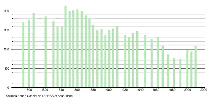- ↑ Par convention dans Wikipédia, le principe a été retenu de n’afficher dans le tableau des recensements et le graphique, pour les populations légales postérieures à 1999, que les populations correspondant à une enquête exhaustive de recensement pour les communes de moins de 10 000 habitants, et que les populations des années 2006, 2011, 2016, etc. pour les communes de plus de 10 000 habitants, ainsi que la dernière population légale publiée par l’Insee pour l'ensemble des communes.