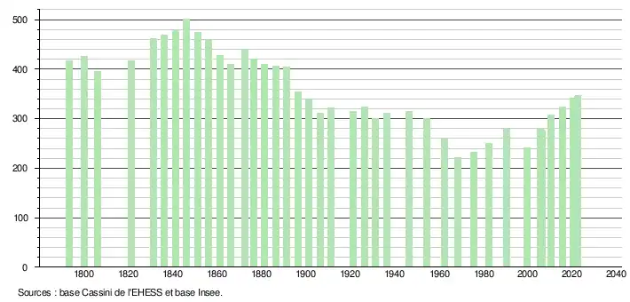 L'évolution du nombre d'habitants est connue à travers les recensements de la population effectués dans la commune depuis 1793. Pour les communes de moins de 10 000 habitants, une enquête de recensement portant sur toute la population est réalisée tous les cinq ans, les populations de référence des années intermédiaires étant quant à elles estimées par interpolation ou extrapolation[21]. Pour la commune, le premier recensement exhaustif entrant dans le cadre du nouveau dispositif a été réalisé en 2005[22].