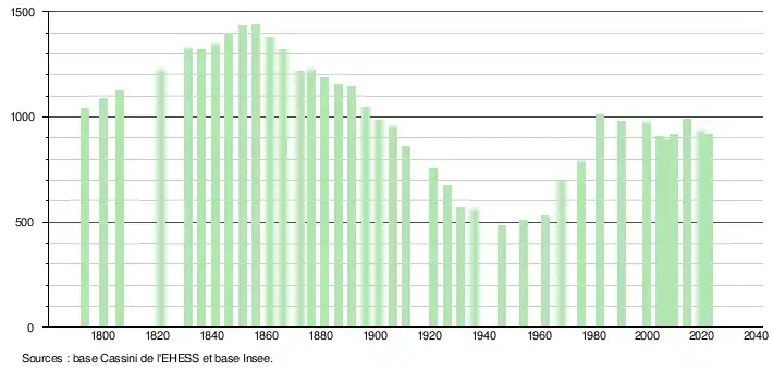 L'évolution du nombre d'habitants est connue à travers les recensements de la population effectués dans la commune depuis 1793. Pour les communes de moins de 10 000 habitants, une enquête de recensement portant sur toute la population est réalisée tous les cinq ans, les populations de référence des années intermédiaires étant quant à elles estimées par interpolation ou extrapolation[20]. Pour la commune, le premier recensement exhaustif entrant dans le cadre du nouveau dispositif a été réalisé en 2004[21].