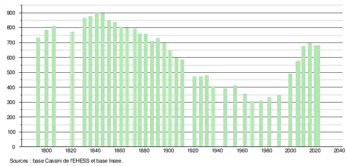L'évolution du nombre d'habitants est connue à travers les recensements de la population effectués dans la commune depuis 1793. Pour les communes de moins de 10 000 habitants, une enquête de recensement portant sur toute la population est réalisée tous les cinq ans, les populations de référence des années intermédiaires étant quant à elles estimées par interpolation ou extrapolation[25]. Pour la commune, le premier recensement exhaustif entrant dans le cadre du nouveau dispositif a été réalisé en 2005[26].
