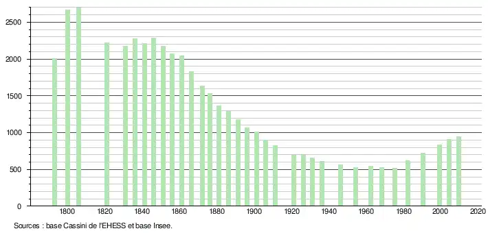 - ↑ Dans le tableau des recensements et le graphique, par convention dans Wikipédia, le principe a été retenu, pour les populations légales postérieures à 1999 de n’afficher dans le tableau des recensements et le graphique que les populations correspondant à l'année 2006, première population légale publiée calculée conformément aux concepts définis dans le décret no 2003-485 du 5 juin 2003, et les années correspondant à une enquête exhaustive de recensement pour les communes de moins de 10 000 habitants, ainsi que la dernière population légale publiée par l’Insee.