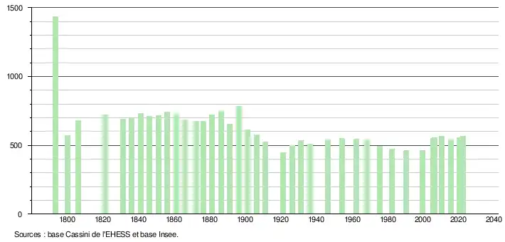 L'évolution du nombre d'habitants est connue à travers les recensements de la population effectués dans la commune depuis 1793. Pour les communes de moins de 10 000 habitants, une enquête de recensement portant sur toute la population est réalisée tous les cinq ans, les populations de référence des années intermédiaires étant quant à elles estimées par interpolation ou extrapolation[21]. Pour la commune, le premier recensement exhaustif entrant dans le cadre du nouveau dispositif a été réalisé en 2005[22].
