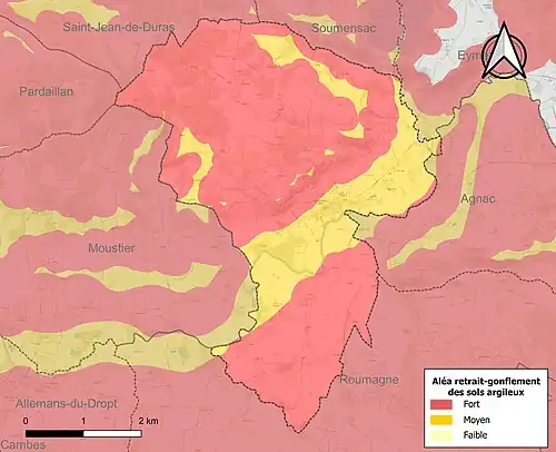 Le retrait-gonflement des sols argileux est susceptible d'engendrer des dommages importants aux bâtiments en cas d’alternance de périodes de sécheresse et de pluie[19]. La totalité de la commune est en aléa moyen ou fort (91,8 % au niveau départemental et 48,5 % au niveau national)[Carte 2]. Depuis le , en application de la loi ELAN, différentes contraintes s'imposent aux vendeurs, maîtres d'ouvrages ou constructeurs de biens situés dans une zone classée en aléa moyen ou fort[Note 1],[20].
