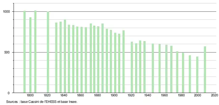 - ↑ Par convention dans Wikipédia, le principe a été retenu de n’afficher dans le tableau des recensements et le graphique, pour les populations légales postérieures à 1999, que les populations correspondant à une enquête exhaustive de recensement pour les communes de moins de 10 000 habitants, et que les populations des années 2006, 2011, 2016, etc. pour les communes de plus de 10 000 habitants, ainsi que la dernière population légale publiée par l’Insee pour l'ensemble des communes.
