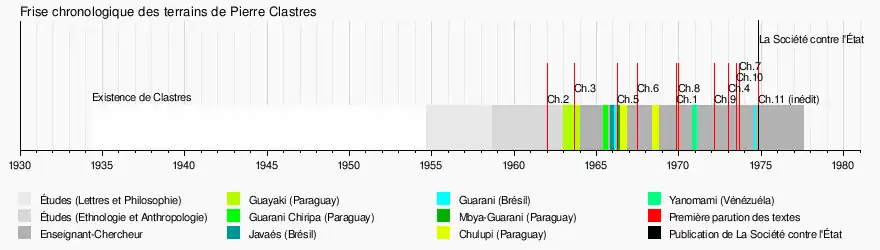 De à , Clastres passe une année auprès des Indiens Guayaki au Paraguay ; en toujours au Paraguay, il séjourne auprès des Indiens Guarani Chiripa ; fin et début , il visite les Javaés du Haut Xingu puis il effectue un court séjour chez les Guarani du littoral de São Paulo ; à l'été , de retour au Paraguay, il séjourne brièvement chez des Mbya-Guarani ; par deux fois, en (juin à octobre) et en (juin à septembre), il visite les Indiens Chulupi (ou Ashluslay) qui vivent dans le Chaco au Paraguay ; entre et , au Venezuela, il séjourne chez les Indiens Yanomami ; enfin, en , il rencontre des Indiens Guarani au Brésil dans l'état de São-Paulo[B 51].