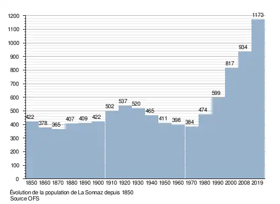 Selon l'Office fédéral de la statistique, La Sonnaz compte 1 406 habitants en 2023[1]. Sa densité de population atteint 204 hab./km2.