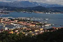 La ville se trouve entre Gênes et Pise, au bord d'un petit golfe à l'extrémité sud de la côte montagneuse de Ligurie, elle regarde vers le sud et la Toscane. Elle est un important port marchand, qui comprend aussi l'Arsenal de la Marine Militaire dans une importante base de la marine italienne, un musée naval et de nombreux chantiers navals.