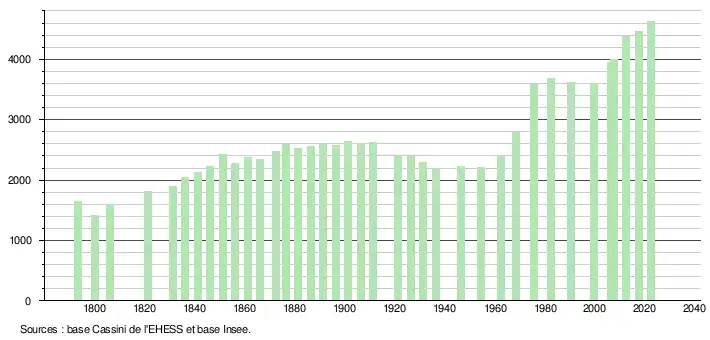 L'évolution du nombre d'habitants est connue à travers les recensements de la population effectués dans la commune depuis 1793. Pour les communes de moins de 10 000 habitants, une enquête de recensement portant sur toute la population est réalisée tous les cinq ans, les populations de référence des années intermédiaires étant quant à elles estimées par interpolation ou extrapolation[36]. Pour la commune, le premier recensement exhaustif entrant dans le cadre du nouveau dispositif a été réalisé en 2007[37].