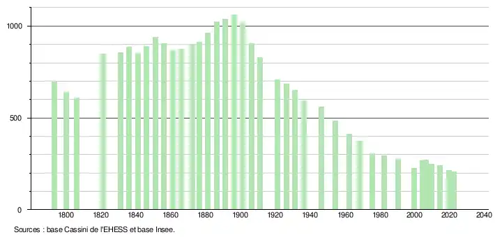 L'évolution du nombre d'habitants est connue à travers les recensements de la population effectués dans la commune depuis 1793. Pour les communes de moins de 10 000 habitants, une enquête de recensement portant sur toute la population est réalisée tous les cinq ans, les populations de référence des années intermédiaires étant quant à elles estimées par interpolation ou extrapolation[16]. Pour la commune, le premier recensement exhaustif entrant dans le cadre du nouveau dispositif a été réalisé en 2004[17].