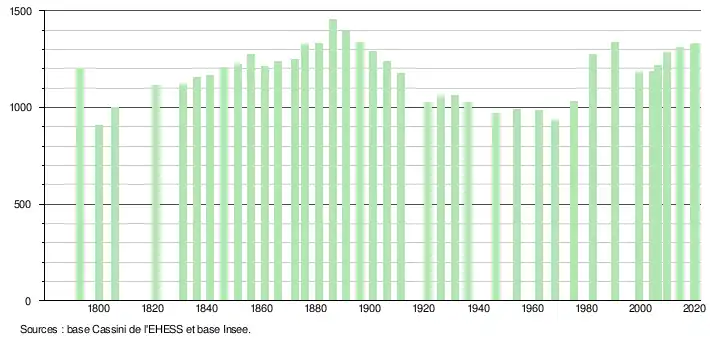 L'évolution du nombre d'habitants est connue à travers les recensements de la population effectués dans la commune depuis 1793. Pour les communes de moins de 10 000 habitants, une enquête de recensement portant sur toute la population est réalisée tous les cinq ans, les populations de référence des années intermédiaires étant quant à elles estimées par interpolation ou extrapolation[16]. Pour la commune, le premier recensement exhaustif entrant dans le cadre du nouveau dispositif a été réalisé en 2004[17].