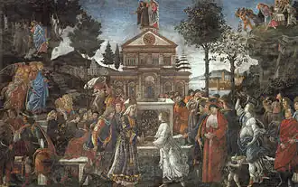 Sandro Botticelli, aidé par de nombreux assistants, peint trois scènes. Le , son contrat est renouvelé, afin de réaliser les autres scènes pour compléter la décoration de la chapelle. Cependant, le , son père meurt : il retourne à Florence sans revenir à Rome.