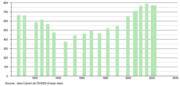 L'évolution du nombre d'habitants est connue à travers les recensements de la population effectués dans la commune depuis 1906. Pour les communes de moins de 10 000 habitants, une enquête de recensement portant sur toute la population est réalisée tous les cinq ans, les populations de référence des années intermédiaires étant quant à elles estimées par interpolation ou extrapolation[16]. Pour la commune, le premier recensement exhaustif entrant dans le cadre du nouveau dispositif a été réalisé en 2005[17].