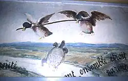 - Alors les canards firent prendre à la tortue un petit bâton par le milieu, qu'elle serra bien fort entre ses dents et, lui recommandant ensuite de tenir ferme, deux canards prirent le bâton chacun par un bout et enlevèrent la tortue de cette façon. Quand ils furent au-dessus d'un village, les habitants qui les virent, étonnés de la nouveauté de ce spectacle, se mirent à crier tous à la fois, ce qui faisait un charivari que la tortue écoutait impatiemment. À la fin, ne pouvant plus garder le silence, elle voulut dire :