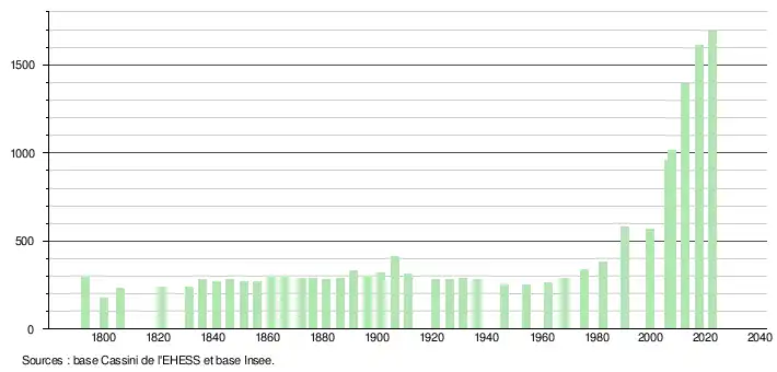 L'évolution du nombre d'habitants est connue à travers les recensements de la population effectués dans la commune depuis 1793. Pour les communes de moins de 10 000 habitants, une enquête de recensement portant sur toute la population est réalisée tous les cinq ans, les populations de référence des années intermédiaires étant quant à elles estimées par interpolation ou extrapolation[15]. Pour la commune, le premier recensement exhaustif entrant dans le cadre du nouveau dispositif a été réalisé en 2007[16].