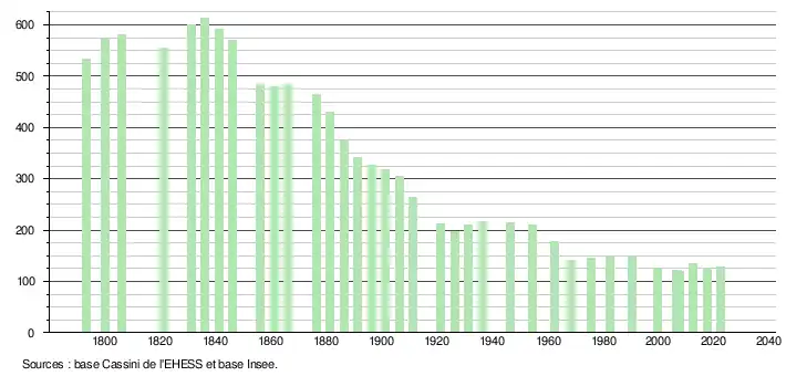 L'évolution du nombre d'habitants est connue à travers les recensements de la population effectués dans la commune depuis 1793. Pour les communes de moins de 10 000 habitants, une enquête de recensement portant sur toute la population est réalisée tous les cinq ans, les populations de référence des années intermédiaires étant quant à elles estimées par interpolation ou extrapolation[28]. Pour la commune, le premier recensement exhaustif entrant dans le cadre du nouveau dispositif a été réalisé en 2007[29].