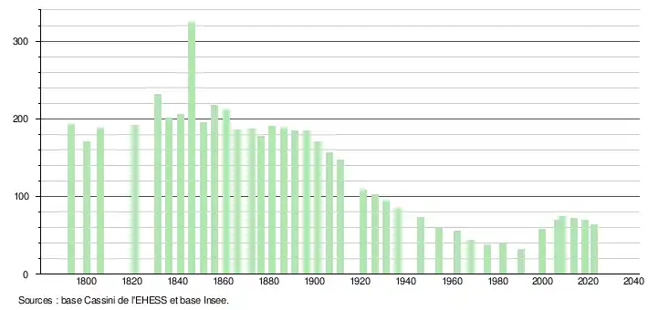 L'évolution du nombre d'habitants est connue à travers les recensements de la population effectués dans la commune depuis 1793. Pour les communes de moins de 10 000 habitants, une enquête de recensement portant sur toute la population est réalisée tous les cinq ans, les populations de référence des années intermédiaires étant quant à elles estimées par interpolation ou extrapolation[14]. Pour la commune, le premier recensement exhaustif entrant dans le cadre du nouveau dispositif a été réalisé en 2008[15].