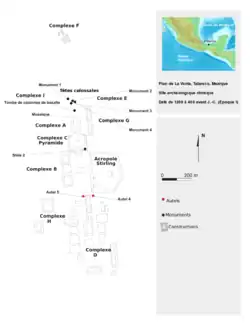 Le site est parsemé de tumuli, qui forment des ensembles appelés « complexes », désignés par les lettres A à I. Ils forment un ensemble cérémoniel avec, outre les tumuli, les sculptures et les offrandes cachées qui en font partie intégrante. Faute de fouilles, il est impossible de savoir si des bâtiments occupaient les sommets des tumuli. Une des hypothèses est que les tumuli étaient le théâtre de cérémonies qu'on pouvait observer des cours en contrebas. La plupart des tumuli de la partie nord ont été détruits lors de l'exploitation du gisement pétrolier. Deux groupes de sculptures, dont quatre têtes colossales, sont tout ce qu'il en reste.