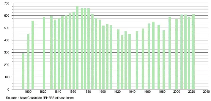 L'évolution du nombre d'habitants est connue à travers les recensements de la population effectués dans la commune depuis 1793. Pour les communes de moins de 10 000 habitants, une enquête de recensement portant sur toute la population est réalisée tous les cinq ans, les populations de référence des années intermédiaires étant quant à elles estimées par interpolation ou extrapolation[16]. Pour la commune, le premier recensement exhaustif entrant dans le cadre du nouveau dispositif a été réalisé en 2006[17].