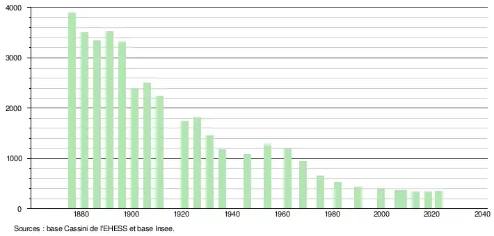 L'évolution du nombre d'habitants est connue à travers les recensements de la population effectués dans la commune depuis 1876. Pour les communes de moins de 10 000 habitants, une enquête de recensement portant sur toute la population est réalisée tous les cinq ans, les populations de référence des années intermédiaires étant quant à elles estimées par interpolation ou extrapolation[24]. Pour la commune, le premier recensement exhaustif entrant dans le cadre du nouveau dispositif a été réalisé en 2008[25].