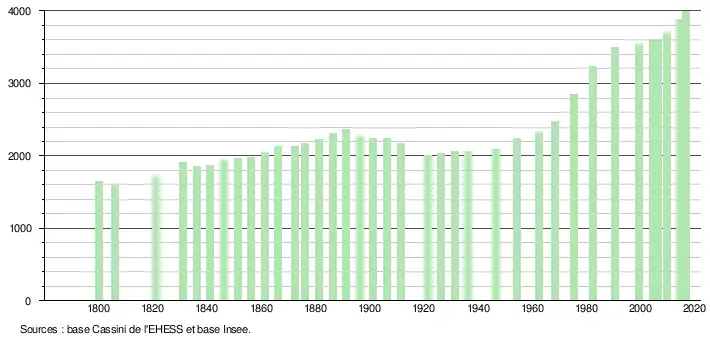 L'évolution du nombre d'habitants est connue à travers les recensements de la population effectués dans la commune depuis 1800. Pour les communes de moins de 10 000 habitants, une enquête de recensement portant sur toute la population est réalisée tous les cinq ans, les populations de référence des années intermédiaires étant quant à elles estimées par interpolation ou extrapolation[15]. Pour la commune, le premier recensement exhaustif entrant dans le cadre du nouveau dispositif a été réalisé en 2004[16].
