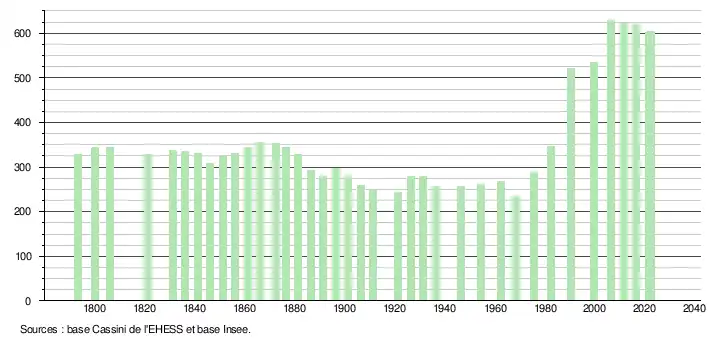 L'évolution du nombre d'habitants est connue à travers les recensements de la population effectués dans la commune depuis 1793. Pour les communes de moins de 10 000 habitants, une enquête de recensement portant sur toute la population est réalisée tous les cinq ans, les populations de référence des années intermédiaires étant quant à elles estimées par interpolation ou extrapolation[29]. Pour la commune, le premier recensement exhaustif entrant dans le cadre du nouveau dispositif a été réalisé en 2006[30].