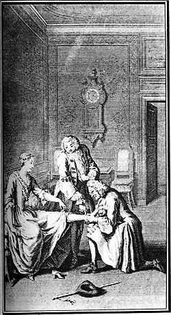 Quant à Madame Dutour, la lingère qui songe plus à ses intérêts qu’à la vertu de sa pensionnaire, Marivaux s’empare avec audace des tours de phrases, des locutions du peuple pour les lui prêter avec art. Même si on a reproché à Marivaux, bien avant Zola[10], de rapporter des discours vulgaires, la scène de la dispute entre le cocher et celle-ci qui ne veut pas le payer au retour de Marianne de chez Valville est un dialogue plein de vivacité rempli d’images neuves et hardies. De même, les réflexions naïves et innocentes de Madame Dutour, qui ne sont que l’expression mal dissimulée de l’intérêt personnel, en alliant tout à la fois épithètes triviales, idées communes, réflexions justes et sentiments vulgaires, ont un effet de réel qui interpelle le lecteur[11]. De même, le noble Valville qui conçoit pour Marianne une vive passion, bientôt partagée, parait, avec la progression de récit, plus fétichiste qu’amoureux[12].