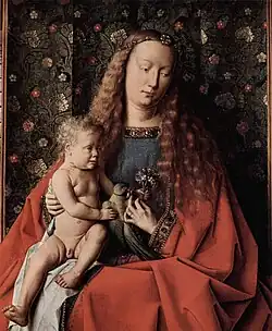 La Vierge est vêtue d'une robe bleue et d'un somptueux manteau rouge. Elle est assise sur un trône situé sur une estrade, devant un baldaquin de brocard orné de roses, symbole d'amour, de lys, symbole de pureté, et de narcisses, symbole de renouveau[12]. La scène se situant à l'intérieur d'une église, la Vierge se trouve à l'emplacement de l'autel. Le sol et l'estrade du trône sont recouverts d'un tapis oriental[11]. Les accoudoirs du trône sont ornés de sculptures représentant à gauche Adam et Caïn tuant Abel et à droite Ève et Samson tuant le lion[13]. Le visage idéalisé de Marie est très similaire à celui de la Vierge de l'Annonciation de van Eyck conservée à Washington[14].
