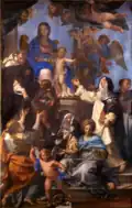 Dans la partie inférieure, le saint est entouré d'autres saints et saintes en adoration de la Vierge et l'Enfant. Le contrat de la commande du tableau rédigé en 1625[4] indique la liste des saints à représenter : trois saints dominicains : Dominique, Catherine de Sienne, Vincent Ferrier, et cinq saints liés à la ville de Palerme et à la Sicile : Christine de Tyr, Nymphe, Olive, Agathe, et Rosalie de Palerme, la raison pour laquelle le tableau avait été commandé.