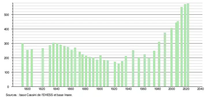 L'évolution du nombre d'habitants est connue à travers les recensements de la population effectués dans la commune depuis 1793. Pour les communes de moins de 10 000 habitants, une enquête de recensement portant sur toute la population est réalisée tous les cinq ans, les populations de référence des années intermédiaires étant quant à elles estimées par interpolation ou extrapolation[24]. Pour la commune, le premier recensement exhaustif entrant dans le cadre du nouveau dispositif a été réalisé en 2008[25].