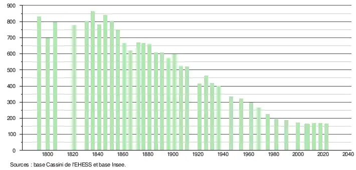 L'évolution du nombre d'habitants est connue à travers les recensements de la population effectués dans la commune depuis 1793. Pour les communes de moins de 10 000 habitants, une enquête de recensement portant sur toute la population est réalisée tous les cinq ans, les populations de référence des années intermédiaires étant quant à elles estimées par interpolation ou extrapolation[21]. Pour la commune, le premier recensement exhaustif entrant dans le cadre du nouveau dispositif a été réalisé en 2007[22].