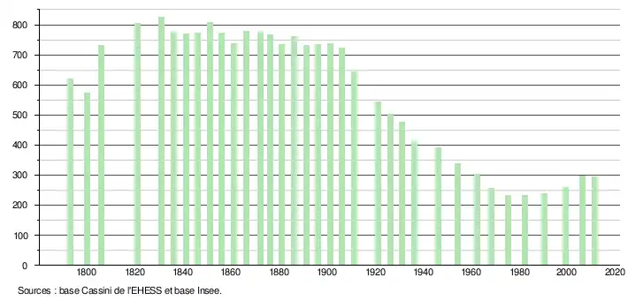 L'évolution du nombre d'habitants est connue à travers les recensements de la population effectués dans la commune depuis 1793. À partir du , les populations légales des communes sont publiées annuellement dans le cadre d'un recensement qui repose désormais sur une collecte d'information annuelle, concernant successivement tous les territoires communaux au cours d'une période de cinq ans. Pour les communes de moins de 10 000 habitants, une enquête de recensement portant sur toute la population est réalisée tous les cinq ans, les populations légales des années intermédiaires étant quant à elles estimées par interpolation ou extrapolation[3]. Pour la commune, le premier recensement exhaustif entrant dans le cadre du nouveau dispositif a été réalisé en 2006[4],[Note 1].