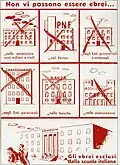 La campagne raciste et antisémite en Italie se fit d'abord à travers la publication du « Manifesto della razza » (Manifeste sur la race) dans le journal Il Giornale d’Italia, le [5] puis en page 2 du premier numéro de la Difesa della razza du , dans lequel s'illustraient en 10 points, l'importance du racisme particulièrement à l'égard des Juifs et des Tziganes[13], et la supériorité de la race italienne devenue « pure race d'origine aryenne incontestable », à l'aide de représentations graphiques claires qui permettaient une compréhension simplifiée des lois raciales fascistes et qui voulait donner au peuple un sentiment national de fierté raciale par son appartenance à une « race pure italienne »[14],[15],[12].