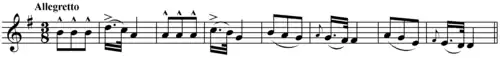 La première exposition, en si majeur, est notée Allegretto. La mesure à 3/8 (à trois temps binaire, la croche égale un temps) est marquée par un premier temps appuyé confié aux instruments graves (contrebasses, violoncelles, deuxième basson et tuba) et les deuxième et troisième, légers et rebondis, joués par les violons et les cors.
