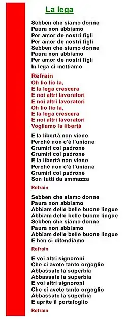 On peut l'entendre dans le film 1900 de Bernardo Bertolucci quand les paysannes sous la conduite d'Anna, la femme d'Olmo, manifestent contre l'expulsion des fermiers qui n'ont pas pu régler leur loyer aux riches propriétaires. Elle est également fredonnée par les frères Ribero dans la deuxième partie du téléfilm L'École du pouvoir, de Raoul Peck, et chantée par trois jeunes femmes dans le film documentaire Alors. Heureux.se.s? (2019) de Marine Guizy.