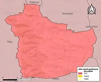 Le retrait-gonflement des sols argileux est susceptible d'engendrer des dommages importants aux bâtiments en cas d’alternance de périodes de sécheresse et de pluie. La totalité de la commune est en aléa moyen ou fort (94,5 % au niveau départemental et 48,5 % au niveau national). Sur les 168 bâtiments dénombrés sur la commune en 2019, 168 sont en aléa moyen ou fort, soit 100 %, à comparer aux 93 % au niveau départemental et 54 % au niveau national. Une cartographie de l'exposition du territoire national au retrait gonflement des sols argileux est disponible sur le site du BRGM[20],[Carte 3].