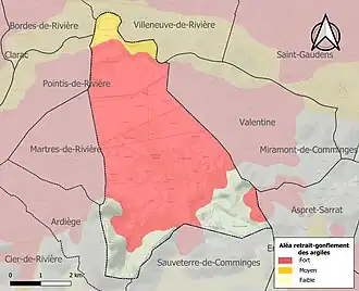 Le retrait-gonflement des sols argileux est susceptible d'engendrer des dommages importants aux bâtiments en cas d’alternance de périodes de sécheresse et de pluie. 81,6 % de la superficie communale est en aléa moyen ou fort (88,8 % au niveau départemental et 48,5 % au niveau national). Sur les 693 bâtiments dénombrés sur la commune en 2019, 693 sont en aléa moyen ou fort, soit 100 %, à comparer aux 98 % au niveau départemental et 54 % au niveau national. Une cartographie de l'exposition du territoire national au retrait gonflement des sols argileux est disponible sur le site du BRGM[34],[Carte 3].