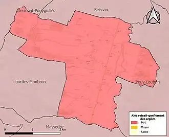 Le retrait-gonflement des sols argileux est susceptible d'engendrer des dommages importants aux bâtiments en cas d’alternance de périodes de sécheresse et de pluie. La totalité de la commune est en aléa moyen ou fort (94,5 % au niveau départemental et 48,5 % au niveau national). Sur les 77 bâtiments dénombrés sur la commune en 2019, 77 sont en aléa moyen ou fort, soit 100 %, à comparer aux 93 % au niveau départemental et 54 % au niveau national. Une cartographie de l'exposition du territoire national au retrait gonflement des sols argileux est disponible sur le site du BRGM[19],[Carte 3].