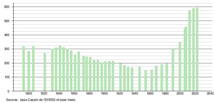 L'évolution du nombre d'habitants est connue à travers les recensements de la population effectués dans la commune depuis 1793. Pour les communes de moins de 10 000 habitants, une enquête de recensement portant sur toute la population est réalisée tous les cinq ans, les populations de référence des années intermédiaires étant quant à elles estimées par interpolation ou extrapolation[29]. Pour la commune, le premier recensement exhaustif entrant dans le cadre du nouveau dispositif a été réalisé en 2007[30].