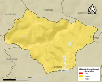 Le retrait-gonflement des sols argileux est susceptible d'engendrer des dommages importants aux bâtiments en cas d’alternance de périodes de sécheresse et de pluie. 97,9 % de la superficie communale est en aléa moyen ou fort (67,7 % au niveau départemental et 48,5 % au niveau national). Sur les 207 bâtiments dénombrés sur la commune en 2019, 198 sont en aléa moyen ou fort, soit 96 %, à comparer aux 72 % au niveau départemental et 54 % au niveau national. Une cartographie de l'exposition du territoire national au retrait gonflement des sols argileux est disponible sur le site du BRGM[19],[Carte 2].
