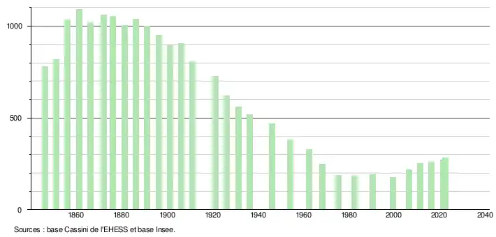L'évolution du nombre d'habitants est connue à travers les recensements de la population effectués dans la commune depuis 1846. Pour les communes de moins de 10 000 habitants, une enquête de recensement portant sur toute la population est réalisée tous les cinq ans, les populations de référence des années intermédiaires étant quant à elles estimées par interpolation ou extrapolation[25]. Pour la commune, le premier recensement exhaustif entrant dans le cadre du nouveau dispositif a été réalisé en 2006[26].
