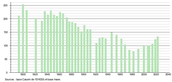 L'évolution du nombre d'habitants est connue à travers les recensements de la population effectués dans la commune depuis 1793. Pour les communes de moins de 10 000 habitants, une enquête de recensement portant sur toute la population est réalisée tous les cinq ans, les populations de référence des années intermédiaires étant quant à elles estimées par interpolation ou extrapolation[25]. Pour la commune, le premier recensement exhaustif entrant dans le cadre du nouveau dispositif a été réalisé en 2008[26].