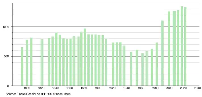 L'évolution du nombre d'habitants est connue à travers les recensements de la population effectués dans la commune depuis 1793. Pour les communes de moins de 10 000 habitants, une enquête de recensement portant sur toute la population est réalisée tous les cinq ans, les populations de référence des années intermédiaires étant quant à elles estimées par interpolation ou extrapolation[33]. Pour la commune, le premier recensement exhaustif entrant dans le cadre du nouveau dispositif a été réalisé en 2007[34].