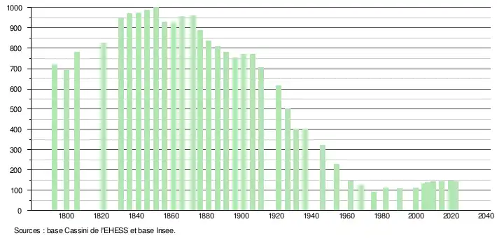 L'évolution du nombre d'habitants est connue à travers les recensements de la population effectués dans la commune depuis 1793. Pour les communes de moins de 10 000 habitants, une enquête de recensement portant sur toute la population est réalisée tous les cinq ans, les populations de référence des années intermédiaires étant quant à elles estimées par interpolation ou extrapolation[18]. Pour la commune, le premier recensement exhaustif entrant dans le cadre du nouveau dispositif a été réalisé en 2004[19].
