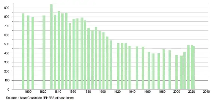 L'évolution du nombre d'habitants est connue à travers les recensements de la population effectués dans la commune depuis 1793. Pour les communes de moins de 10 000 habitants, une enquête de recensement portant sur toute la population est réalisée tous les cinq ans, les populations de référence des années intermédiaires étant quant à elles estimées par interpolation ou extrapolation[14]. Pour la commune, le premier recensement exhaustif entrant dans le cadre du nouveau dispositif a été réalisé en 2005[15].