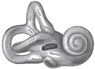 Cochlée (en), vestibule de l'oreille, canaux semi-circulaires, lateral semicircular canal (d), anterior semicircular canal (d), posterior semicircular canal (d), aqueduc du vestibule (en), aqueduc de la cochlée |